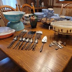 WHAT IS IN THIS AUCTION? This online auction features vanity, small kitchen appliances, Wade miniatures, vintage cameras, teacup/saucer sets, decorative plates, flatware, binoculars, art glass, console radio, vintage Pyrex, Delft-style platter, vint