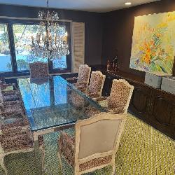 Dining Room Set, Sofas, Coffee tables, End Tables, Mirrors, Pyrex Amish tuquois Butterprint Bowls, China, Secretary Desk, Chairs, Vintage Bowls, Pots, Pans, Vintage Glassware, Barware, Garrard Synchro-lab Garrard Synchro-Lab Series of Vintage Turntab