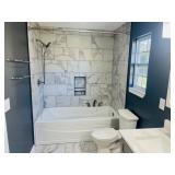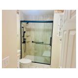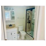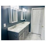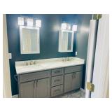 Vanity with glass top with bench and mirror