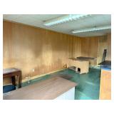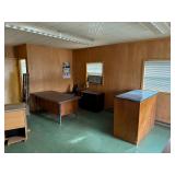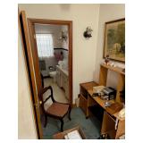 Wood Desk, Framed Dog Print and Figurine Assortment
