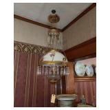 Hanging prism lamp with hand painted milk glass shade, no matching rings, ceiling reel, smoke bell, brass font