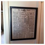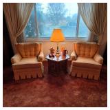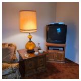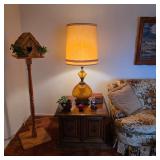 Mid century furniture, including a vintage sofa, coffee table, end tables, lamps, and art