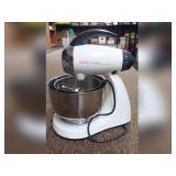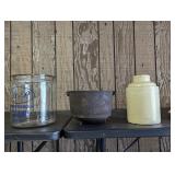 VINTAGE METAL FRUIT STAND, FORMAL GLASS ARCOROC USA BOWL, AND LARGE PYREX MIXING BOWL