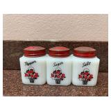 Tipp City milk glass shakers w/ red lids