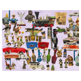 Collectibles as shown includes Route 66 clock, MWOT plate, GurnZGold picture, plastic lion, Hawkeye bottles, etc