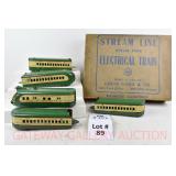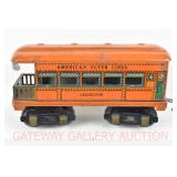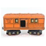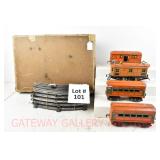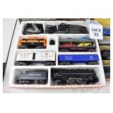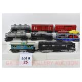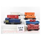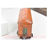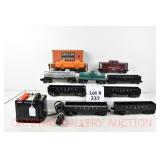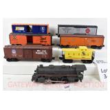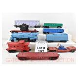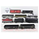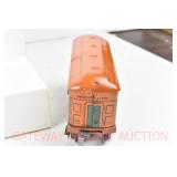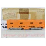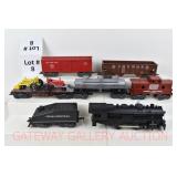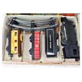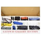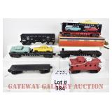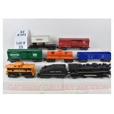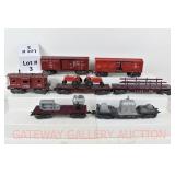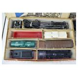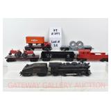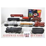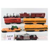 23 MARX O GAUGE: 666 Smoker Loco, Union Pacific Tender, Erie Flat/Burlington Trailer (Scratch On Roof), 176893 NYC Boxcar, 9553 Gulf Tanker, 54099 MP Stock Car, 51170 Blue Erie Gon/Drop Ends, 3900 Union Pacific Caboose