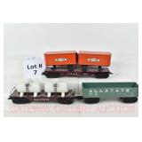 7 MARX O GAUGE: 5543 Allstate Flat/2 White Tanks, CB&Q 5545 Flat/2 Allstate Trailers, 5532 Allstate Gondola