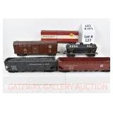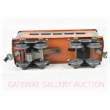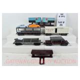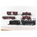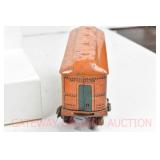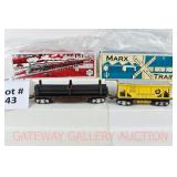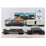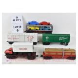 6 MARX O GAUGE: Erie Flatcar/Burlington Tractor Trailer, ACL 74563 Orange Flat/Lumber, 51100 Southern Autorack/4 Cars, 34178 Great Northern Boxcar, 5595 Farm Master Brand Dairy Operating Boxcar