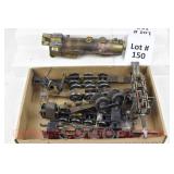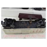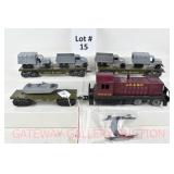 15 MARX O GAUGE: 1998 ATSF Switcher (1 Set Side Frames To Install), 2243 Army Flat/2 Repro Trucks, 2243 Army Flatcar/1 Original, 1 Repro Truck, Short Army Flatcar/Original Boat Load