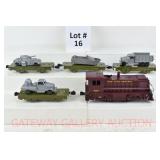 16 MARX O GAUGE: 588 New York Central Switcher, (4) 572M Olive Drab Flats w/3 Repro Loads and Original Boat Load