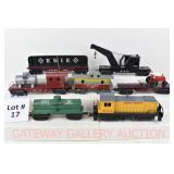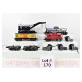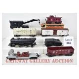 17 MARX O GAUGE: 1998 Union Pacific Switcher DUMMY, 5545 CB&Q Flat/Erie Girder (No Brakewheel), NYC Black Crane, 2532 Cities Service Tanker, Erie Flat/1 Red Tractor, NYC Caboose w/Gray Tank, 1977 AT&SF Caboose