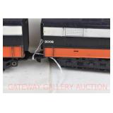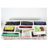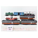 21 MARX O GAUGE: 2002 New Haven ABA E8 Diesels (2 Steps Missing From Power Unit, 1 Step Missing On B Unit), 2532 Cities Service Tanker, 77003 B&M Boxcar, 5545 CB&Q Flat/Burlington Trailers (1 with Chipped Paint), 5561 WCEX Flat/Searchlight