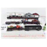 28 MARX O GAUGE: 666 Smoker Loco/Allstate Tender, 3280 SFRD Boxcar, 9553 Allstate Tanker, 5545 Burlington Flat/2 Trailers, Erie Empty Flat/No Tractors, 1977 ATSF Caboose, 18326 NYC Caboose