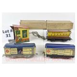 31 MARX O GAUGE: 567 NYC Side Dump Car, 1614 Dumping Unit, 555 C&S Silver Frame/Litho Man Reefer (Paint Chips On Roof), 555 C&S Reefer w/2 Sleeves