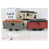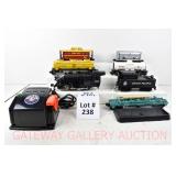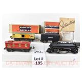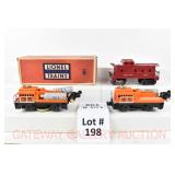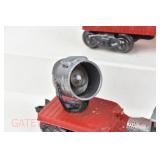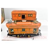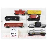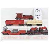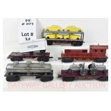 32 MARX O GAUGE: X-246 Rocket Fuel Tanker, WCEX 4571 Spotlight/Generator (Lense And 1 Brakewheel Missing), 4590 AT&SF Work Caboose, 4528 Erie Flat/2 Red Tractors, 347100 RR Gondola