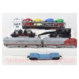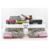 35 MARX O GAUGE: 1095 Santa Fe Dummy A Unit and 1096 Santa Fe Dummy B Unit Diesels, Erie 4528 Flat/2 Gray Tractors, 5590 NYC Crane w/Spotlight (Needs Restrung And Spotlight And Pickup Wired), (2) 51100 Southern Autoracks/4 Cars, CWEX 4566 Flat/No Cable Load (Brakewheels Missing)