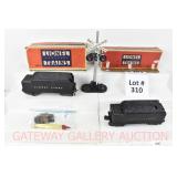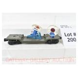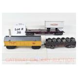 36 MARX O GAUGE: Erie Custom Made Wheel Car, 2824 U S Air Force Rocket Launching Car (No Rocket), 5545 CB&Q Flat/Burlington Trailer
