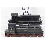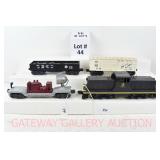 44 POSTWAR LIONEL O GAUGE: 628 Northern Pacific GE 44 Ton Diesel, 6520 Maroon Generator Car, 6014 Frisco Boxcar, 2452 PRR Gondola/Scrap Load