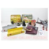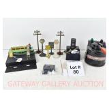 81 MARX O GAUGE: 2940 Grand Central Station (Some Rust), Arcade Etc. Cast Iron Signs: US 30, Yield To the Right, Men Working Ahead, No Parking Here, 2 Telephone Poles