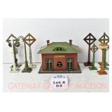 63 LIONEL PREWAR O GAUGE: 126 Lionelville Station, 57 Lamppost (Chipped), 61 Lamp Post, 53 Lamp, (3) 69 Crossing Signs, (1 Chipped) 69 Crossing Sign W/Bell Ringer Attached, (2) O68 Crossing signs
