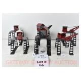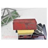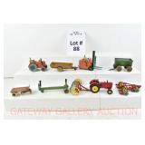 88 DINKY AND MISC TOYS: Massey Ferguson Tractor/No Seat, 301 Orange Tractor, 27K Hayrake, Orange Flatbed Wagon, 3 Gang Reel Mower, 278 Wagon, Coventry Climax Forklift (Paint Loss), Green Tin Wagon/Wooden Wheels, German 3 Wheel Tin Log Wagon