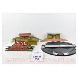 70 HORNBY 2 RAIL O GAUGE: 8 Track Manual Turntable OB, Girder Bridge, (2) Lithographed Stations, (2) Bumpers