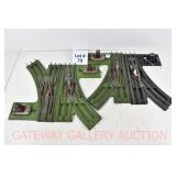 51 MARX O GAUGE: 440 Automatic Gateman (No Sign), 1456 Barrel Loader, 1305 Silver And Yellow PRR Girder Bridges, 1450 Fueling Station, 0442 NYC Derrick (Small Chip On Corner Of 1 Base), (2) 392 Lithographed Tunnels, (2) 1605 Uncoupler, Circuit Breaker