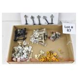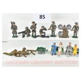 85 BARCLAY FIGURES: (2) Machine Gunners, Listening Post; (4) Sitting Figures/2 Benches; (6) Gray Iron Soldiers; Small Push Cart