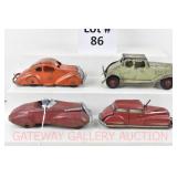86 MISC TOY CARS: Joustra #2002 Miracle Windup Car/No Key, Girard Coupe W/Balloon Tires (Non Motor, Heavy Paint Loss), Wyandotte Orange Air Flow Coupe/Paint Loss, Red Convertible