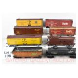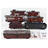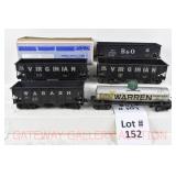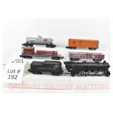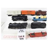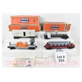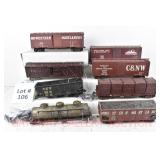 8 MARX O GAUGE: 1666 Smoker w/Smoke At Cylinders, Penn Central Tender With Sound O Power, 4528 Erie Flat/2 Tractors, 28236 Brown Virginian Hopper, 284 UTLX Tanker, 467110 B&O Boxcar, 18326 PC Caboose