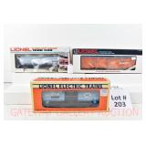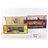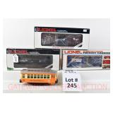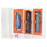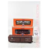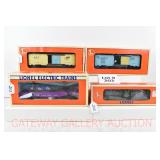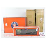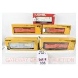 338 Modern Lionel O Gauge: (3) 9818 Western Maryland Reefers, 9431 JLC Prewar Years Boxcar, 9042 Autolight Boxcar OB