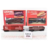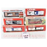 335 Modern Lionel O Gauge: 9780 Johnny Cash Boxcar, 9853 Cracker Jack Reefer, 9307 Cop And Hobo Operating Gondola, 7517 Phila Mint Car, 9779 TCA 1976 Bicentennial Convention Boxcar, 9864 TCA 1974 Seattle Convention Reefer OB