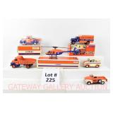 27 MARX O GAUGE: 5545 CB&Q Flat/A C Williams Cast Iron Take Apart Car/Tires, 5545 CB&Q Burlington Flat/Burlington Trailers, 51100 Autorack/3 Cars (1 Chipped), Erie Flat/Semi Truck Cab/1953 Friction Police Car, 51170 Erie Flat/Bottle Loco Smoke/Marlines Allstate Wrecker, Erie Empty Flat/No Tractors