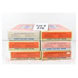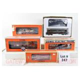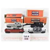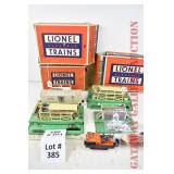 328 Postwar Lionel O Gauge: 6561 Cable Car/Gray Reels, 6462 Red Gon/7 Painted Green Barrels, 6460 Black Crane, 6419 Wrecking Car 4 OB (Some with Flaps Missing)