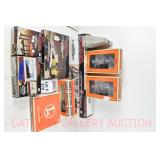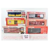 344 Modern Lionel O Gauge: 16651 Animated Clown Circus Car, 16939 Navy Flatcar/Boat, 16957 #6461 Flatcar/Ertl Case Tractor, 19953 #6464-97 Lionel Railroader Club Boxcar, 29202 #6464-497 ATSF Boxcar, 19736 #6417 PRR N5c Caboose OB