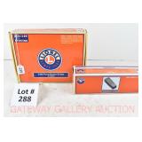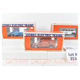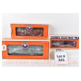 348 Modern Lionel O Gauge: 26707 Lionel Steel Operating Welding Car w/Flashing Blue Light/Moving Welder, 1991 17887 LCCA Convention Car Conrail Flat/Armstrong Trailer, 17889 SP Flat/Golden Pig Service Trailer OB