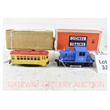 325 Postwar Lionel O Gauge: 60 Trolley Car (Solid Bumper) OB and Instructions, 51 Navy Yard Switcher (Hairline Strut Crack on Left Side) OB/Insert