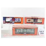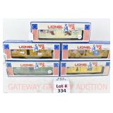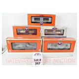 347 Modern Lionel O Gauge: (5) Mint Cars: 19682 Alaska Klondike Mining Co, 19688 #6445 Fort Knox Gold Reserve, 19698 San Francisco Federal Reserve, 19660 Lionelville Bank and Trust, 19676 Philadelphia Federal Reserve Bank