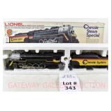 343 Modern Lionel O Gauge: 8003 Chessie System 2-8-4 Berkshire Loco w/Whistle, Mighty SOS, Smoke, And Magnetraction (has very slight bend on fireman side cab roof) OB