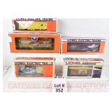 352 Modern Lionel O Gauge: 36728 SP Walking Brakeman Car, 17201 Conrail Boxcar, 5724 PRR Illuminated Bunk Car, 16552 Frisco Searchlight Caboose, 6449 Wendy’s Caboose OB (Paint Off Above #)