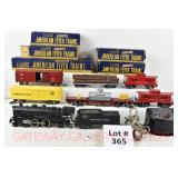 365 American Flyer S Gauge: Steam Freight: 300 4-4-2 Reading Loco/Tender, 639 Boxcar (Catwalk Chipped), 648 Service Car, 605 Flatcar/Logs, 633 B&O Boxcar, 638 AF Caboose (Small Chip in Corner) OB; 806 AFL Caboose, 22004 Transformer No Box