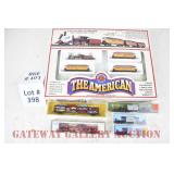 398 Bachmann N Gauge: 50-4405 "The American" 4-4-0 Stem Loco/Tender and 3 Passenger Cars, Power Pack and Track in Set Box; Kato Autorack Car, Minitrains PRR Auto Transporter, Atlas N&W and CN Transformer Cars, Aurora 6 Axle Transformer Car OB