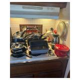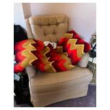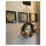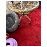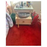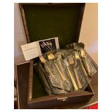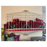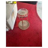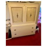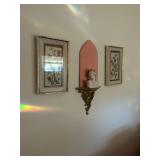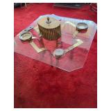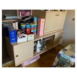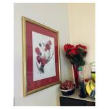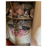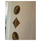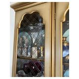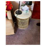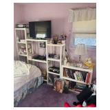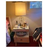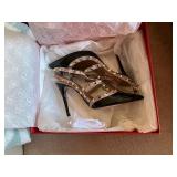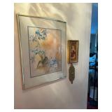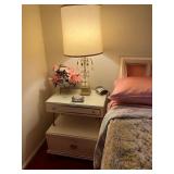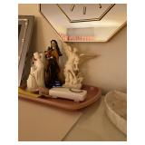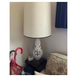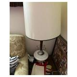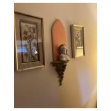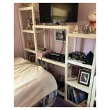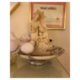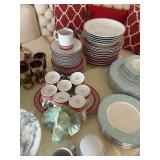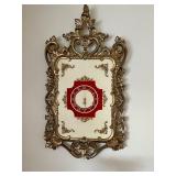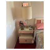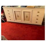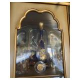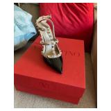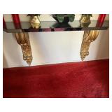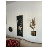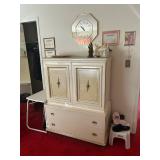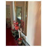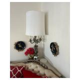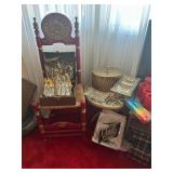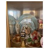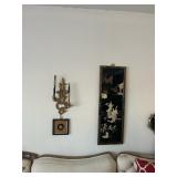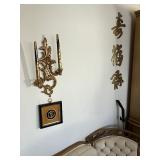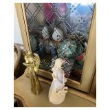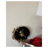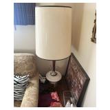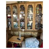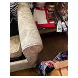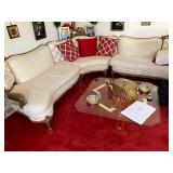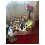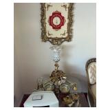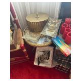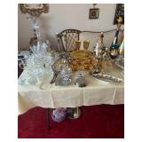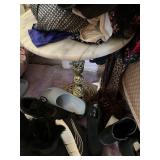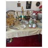Retro tufted sofa, brass and glass coffee and end tables, 50's bedroom set, china closet, assorted chairs, tables, marble top mounted console table & mirror, crystal lamps, ornate gilt wall clock, sconces, wall hanging basket, ornate wall fountain, cherub plaques, Asian screens, mirrors, Castleton Corsage set of china, Bohemian crystal decanter & glasses, tea sets, cobalt decanter with matching glasses, figurines, religious icons, set of gold plated flatware, lots of retro wall art, oils, Mid Century table & lamps, woven basket plant stand, NIB Valentino sandals & lots more |