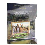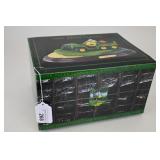 25 Gold John deere 5 Piece Sett With Showcase, 1/64th Scale, With shipping box, Tractor, combine, cotton harvester, sprayer & Forage harvester with the showcase