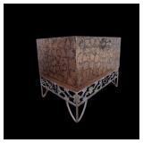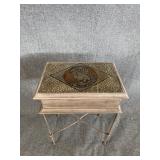Statement pieces: gold-toned chests, mosaic tables, vintage lamps
