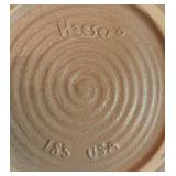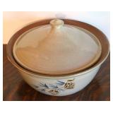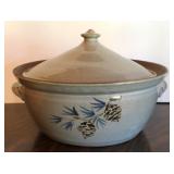 | Jugtown North Carolina Pottery Covered Bowl - Decorated with Pine Cones and Branches Signed Vernon Owen - and Dated 1989 - Bowl Measures 4 1/4" tall 10 1/2" Across |