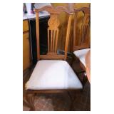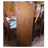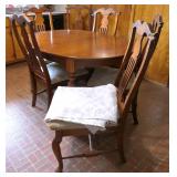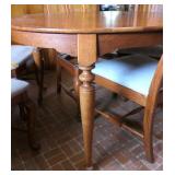 | Lexington Furniture Oak Dining Table and 6 Chairs - Oval Table with 1 Leaf - Chairs with Cushioned Seats - Missing One Seat - Cushion - With Fabric to Cover Other Seats - Table is 30" Tall 57 3/4" by 42" - Leaf Measures 15" |