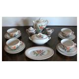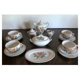 | 17 Piece Child's Porcelain Tea Set - Made in Japan - White with Red Flowers - Tea Pot Measures 3 1/2" Tall Tureen 4 1/2" Across |