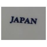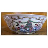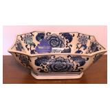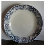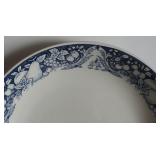 | Large Round Blue and White Serving Bowl with Fruit and Floral Border - Made in Japan - Bowl is 2 3/4" Tall 14 1/4" Across |