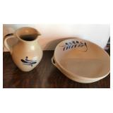 | 2 Pieces of Haeger Pottery with Blue Decoration - Large Double Handled Bowl - 185 and Pitcher - Bowl Measures 11 3/8" Across Pitcher is 8" Tall |
